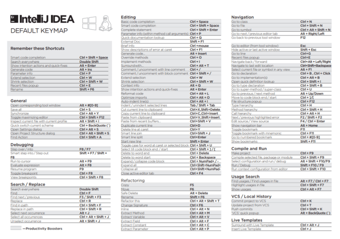 IntelliJ IDEA keyboard shortcuts IntelliJ IDEA has keyboard shortcuts for most of its commands related to editing, navigation, refactoring, debugging, and other tasks. Memorizing these hotkeys can help you stay more productive by keeping your hands on the