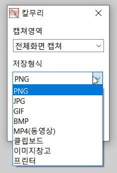 캡쳐된 이미지를 저장할 파일 포맷도 변경이 가능합니다. 클립보드를 선택하면 캡쳐된 이미지를 파일로 저장하지 않고 클립보드에 복사합니다. 캡쳐 후 파워포인트 문서 등에 바로 삽입하는 작업의 경우에 유용한 기능입니다.