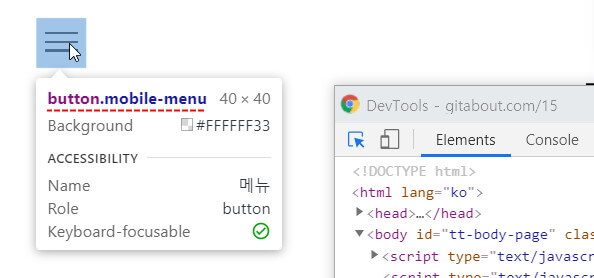 크롬 개발자도구로 메뉴 버튼의 CSS 클래스를 먼저 확인합니다. Poster 스킨의 경우 메뉴 버튼은 mobile-menu라는 클래스를 사용하고 있음을 확인할 수 있습니다.