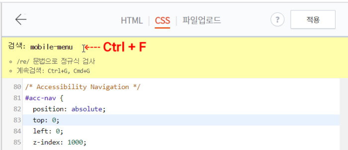 스킨 편집을 위해서 블로그 관리자 메뉴의 스킨 편집 메뉴로 이동합니다. 스킨이 사용하는 CSS를 직접 수정해야 하므로 html 편집 모드 버튼을 클릭하고 CSS 탭을 선택합니다. Ctrl+F 를 누르면 CSS 소스 내 문자열을 검색할 수 있습니다. Ctrl+F 키를 입력 후 mobile-menu 텍스트를 검색합니다.