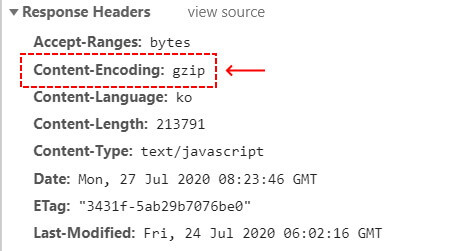 실제로 gzip 압축이 정상적으로 적용되었는지 여부는 브라우저의 개발자 도구에서 간단하게 확인이 가능합니다. 먼저 응답 헤더의 Content-Encoding 헤더 값이 gzip 으로 설정되었는지 확인 합니다. 또 개발자 도구에서 전체 Contents 의 사이즈와 실제 전송된 사이즈를 비교해 보면 압축 효율도 확인이 가능합니다.