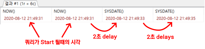 NOW() 의 경우는 한 쿼리문에서 항상 같은 값을 리턴합니다. 반면 SYSDATE()의 경우 매번 호출될 때마다 새롭게 계산된다는 것을 확인할 수 있습니다.