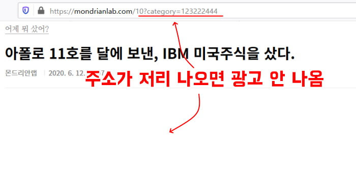 검색엔진에서 유입되거나 블로그 첫 화면에서 오픈되는 페이지의 경우는 애드센스 광고가 정상적으로 출력됩니다. 이때 페이지의 URL 은 https://gitabout.com/9 이런 형태입니다. 카테고리 글 목록에서 클릭되는 경우의 페이지 URL 은 https://gitabout.com/9?category=1134940와 같이 카테고리 ID가 쿼리 스트링으로 포함됩니다.